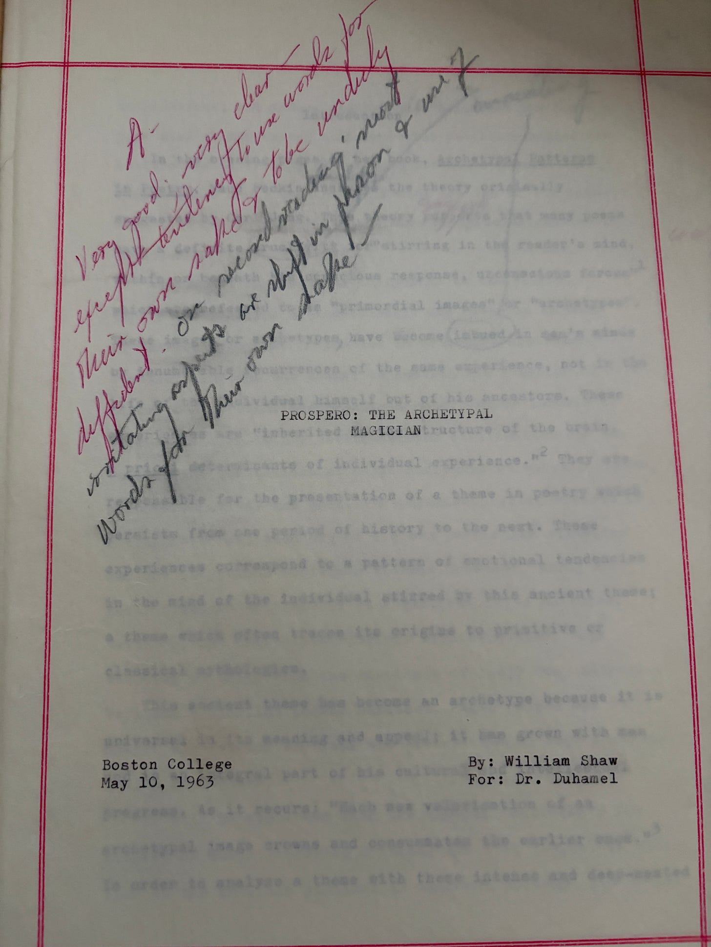 After working on it for several weeks, I spent all that day typing the final draft of my twenty-five page product: “Prospero: The Archetypal Magician.” I had nothing to eat all day, except a bowl of Raisin Bran. I turned in the paper around 4 PM. (I ultimately received a fine grade but with stated reservations about my diction.)