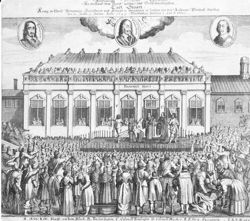 Cromwell’s army defeated the King’s. Charles was captured, imprisoned, placed on trial. When interrogated by his Parliamentary prosecutors, Charles denied Parliament’s authority to judge him, arguing that he answered to none but to God alone. Charles was publicly beheaded on 30 January 1649. England was then reconstituted as a Commonwealth under Oliver Cromwell.